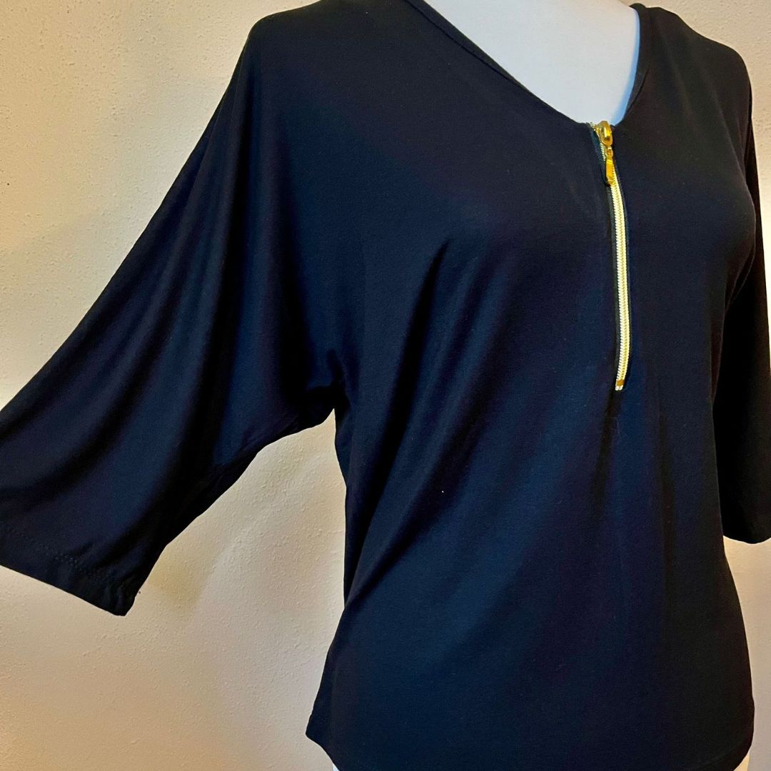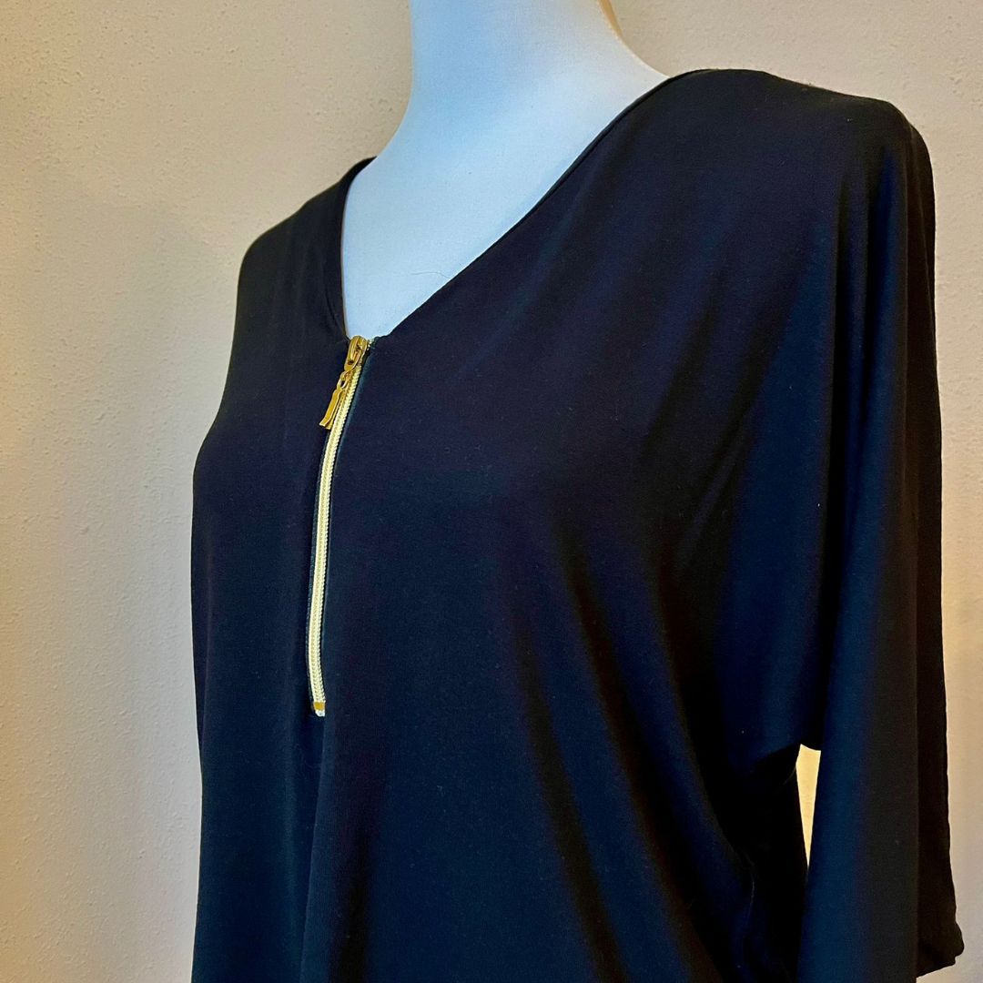 Die lockere Bluse mit ihren dreiviertel langen Armen zeichnet sich durch einen lockeren Fall und taillierten Schnitt aus. Verspielt wirkt der Reißverschluss im Dekolleté, welcher durchaus zu gebrauchen ist und nicht nur der Zierde dient.