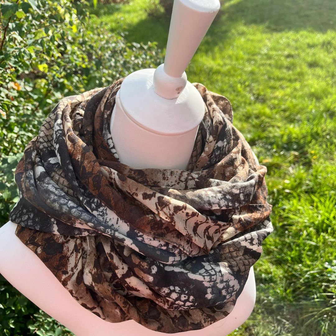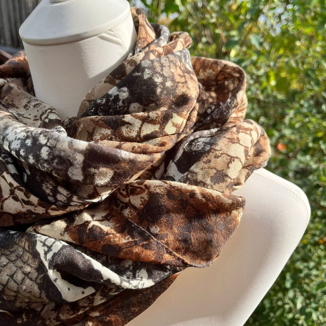 Dieser Loop besticht mit seiner zeitlosen Optik. Das Muster, welches an das Schuppenkleid einer Schlange erinnert, will einfach nicht aus der Mode kommen und lässt sich nicht nur zu schwarzen Leder-, Lackhosen tragen, sondern auch casual like mit einer Jeans und einfarbigen Oberteilen kombinieren.
